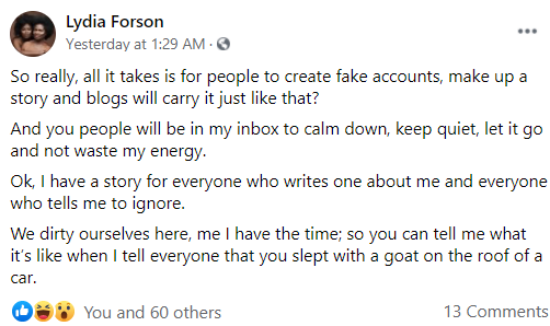 Upon sighting the frivolous rumours, Lydia burst out saying; “So really, all it takes is for people to create fake accounts, make up a story and blogs will carry it just like that?